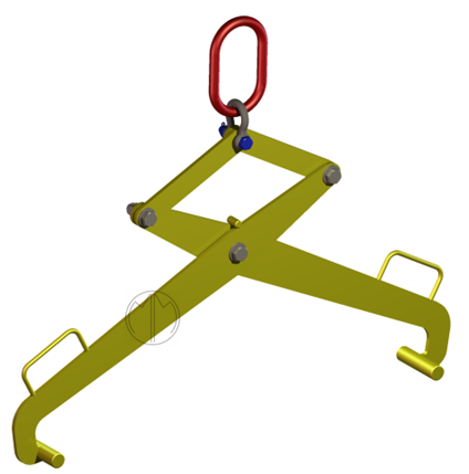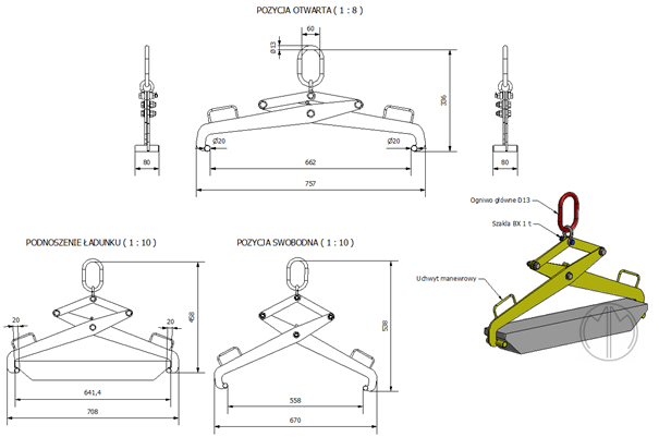 Chwytak służy do transportu ładunków o przekroju trapezowym, których kształt jest dostosowany do kształtu ramion nośnych