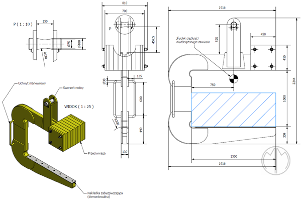Zawiesie jest przeznaczone do transportu ładunków w formie pojedynczych kręgów blach o odpowiednich wymiarach do gardzieli zawiesia oraz o maksymalnej szerokości kręgów 1500 mm