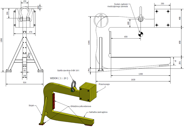 Zawiesie jest przeznaczone do transportu ładunków w formie pojedynczych kręgów blach o odpowiednich wymiarach do gardzieli zawiesia oraz o maksymalnej szerokości kręgów 1300 mm